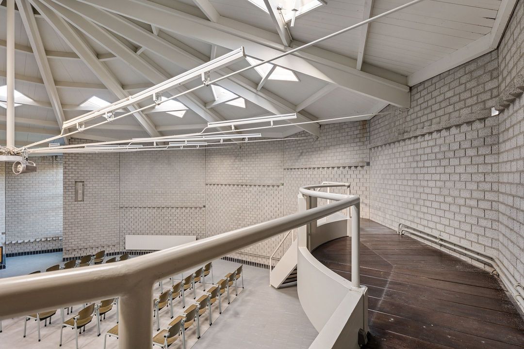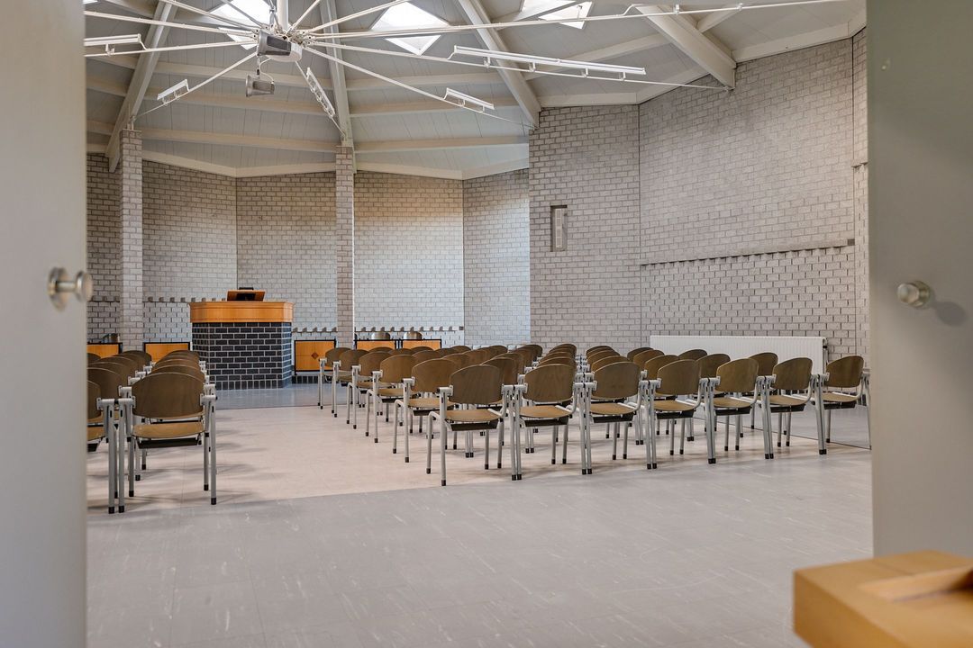Indeling: centrale entree, cirkelvormige kerkzaal (diameter ca. 15 meter; ca. 175m2; nokhoogte ca. 700cm) met balkon, keuken met kantineruimte (ca. 102m2), kantoor/vergaderruimte (ca. 28m2), gescheiden toiletgroep, werkkast, bergruimte.