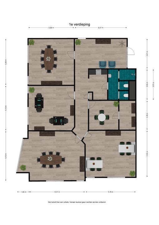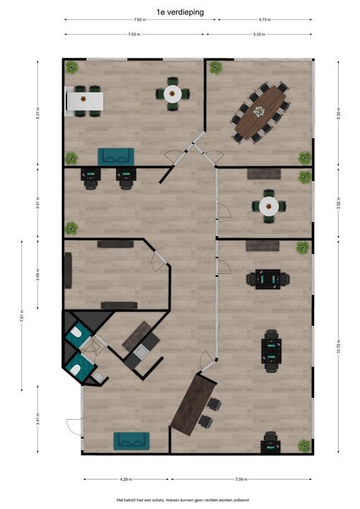 Deze informatie alsmede de inhoud van eventuele bijlagen is zorgvuldig samengesteld. Desondanks wordt onzerzijds geen aansprakelijkheid aanvaard ten aanzien van onvolledigheid en/of onjuistheid, dan wel de gevolgen daarvan. De vermelde informatie is een uitnodiging om in onderhandeling te treden en mag niet als grondslag voor een overeenkomst worden beschouwd. De kennisgeving van deze informatie alsmede een eventuele huurovereenkomst is onder voorbehoud definitieve goedkeuring opdrachtgever. Opdrachtgever heeft het recht de verhuurprocedure naar eigen goeddunken, zonder kennisgeving, te veranderen en heeft tevens het recht om te allen tijde met één of meer gegadigden te onderhandelen en/of zonder opgaaf van reden zich terug te trekken, welke niet zal leiden tot enige aanspraak en/of vergoeding. Overname, plaatsing op internetsites, verveelvoudiging op welke andere wijze dan ook van deze inhoud is niet toegestaan. Alle maten en oppervlakten zijn indicatief. Prijs-/druk-/zetfouten en wijzigingen voorbehouden.