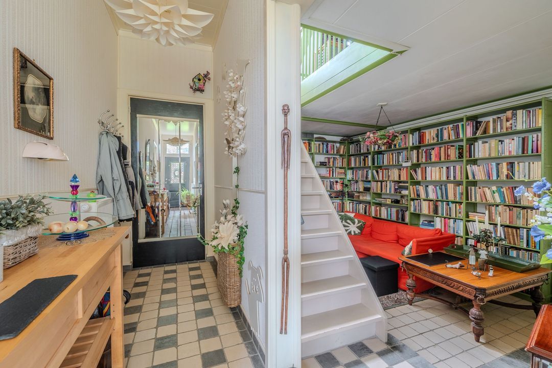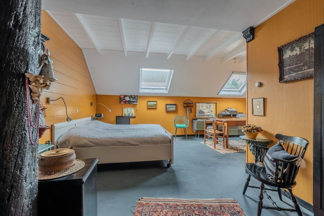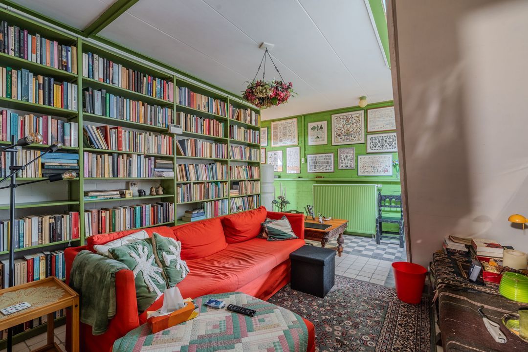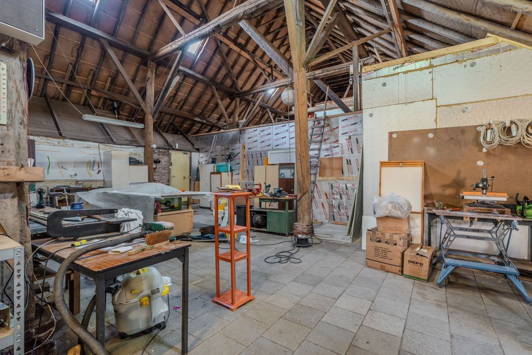 Begane grond: zij-entree/gang, woonkamer in split-level (ca. 40m²) met veel daglichtintreding, gezellige eetkamer (ca. 38m²) aan de tuinzijde, aangrenzende keuken met keukeninrichting en (inbouw)apparatuur, gang, toilet, zeer ruime slaapkamer (ca. 40m²), moderne badkamer met inloopdouche, wastafel met meubel, wandcloset en ligbad. Voorts een bijkeuken, trapopgang met bibliotheek, toegang tot de kelder, heel veel bergruimte (fietsenstalling) en natuurlijk de inpandige schuur van in totaal ca. 300m².