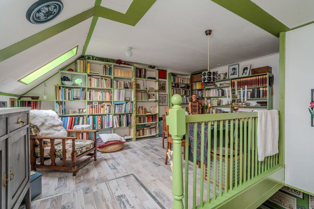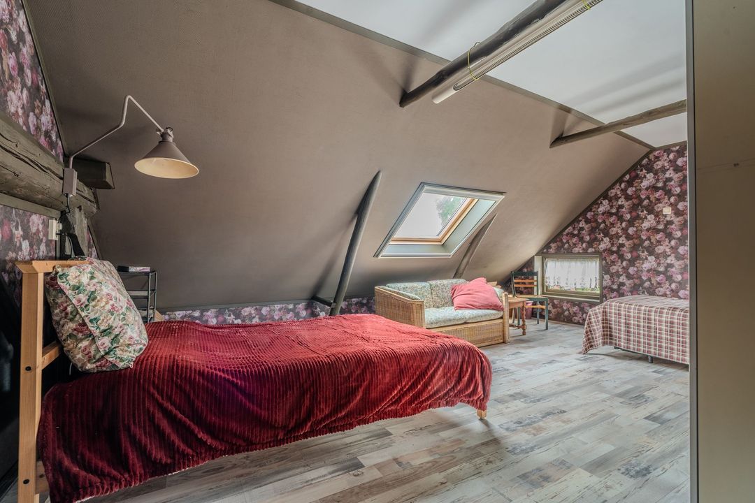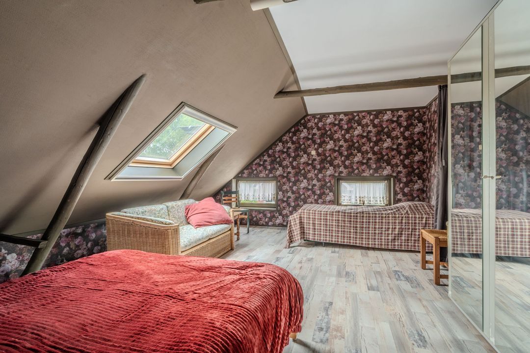 Verdieping: een overloop met study geeft toegang tot twee slaapkamers, op de voormalige graanzolder boven het voorhuis.