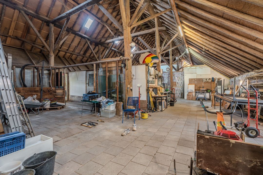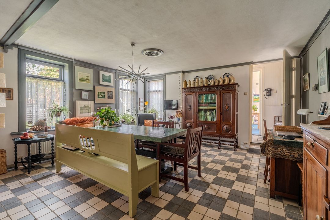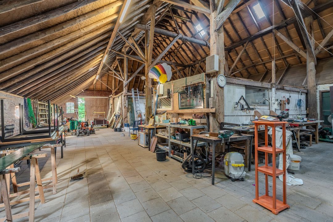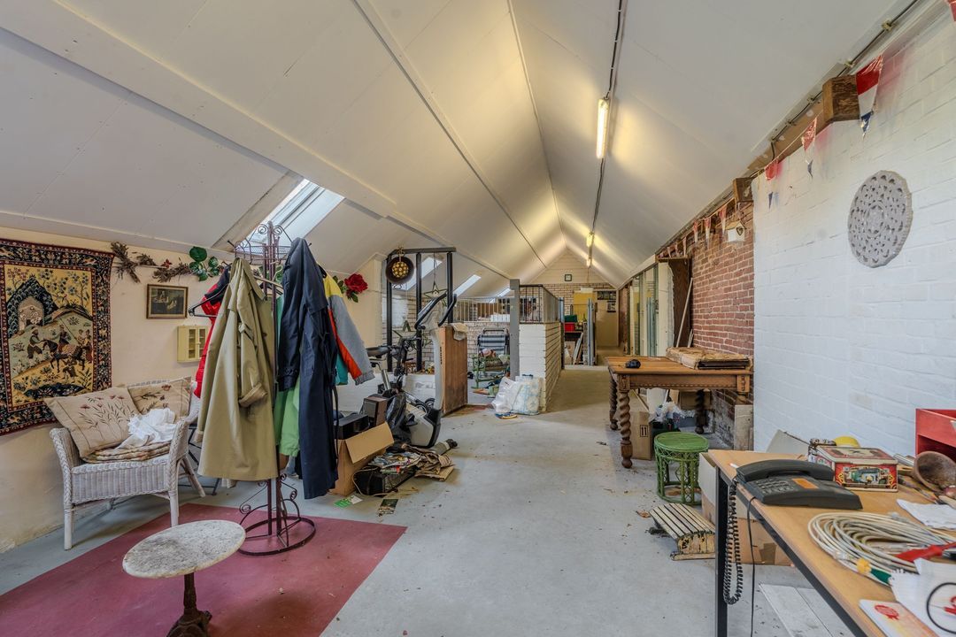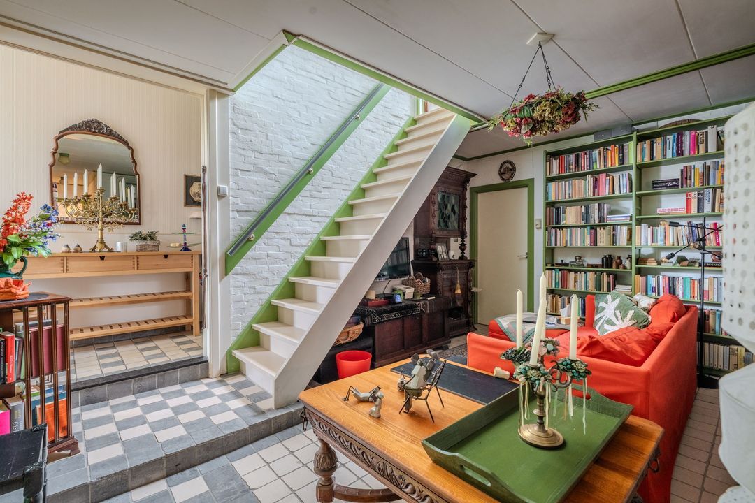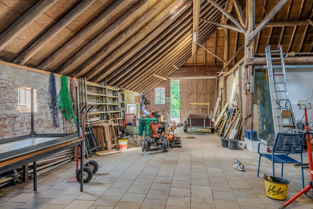 Begane grond: zij-entree/gang, woonkamer in split-level (ca. 40m²) met veel daglichtintreding, gezellige eetkamer (ca. 38m²) aan de tuinzijde, aangrenzende keuken met keukeninrichting en (inbouw)apparatuur, gang, toilet, zeer ruime slaapkamer (ca. 40m²), moderne badkamer met inloopdouche, wastafel met meubel, wandcloset en ligbad. Voorts een bijkeuken, trapopgang met bibliotheek, toegang tot de kelder, heel veel bergruimte (fietsenstalling) en natuurlijk de inpandige schuur van in totaal ca. 300m².