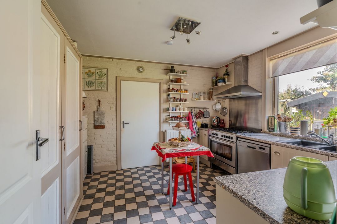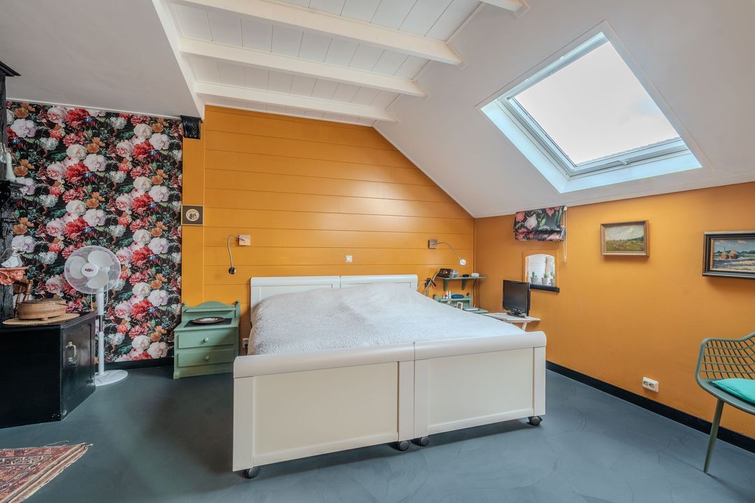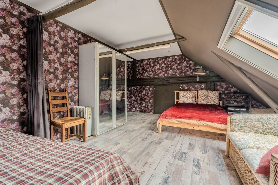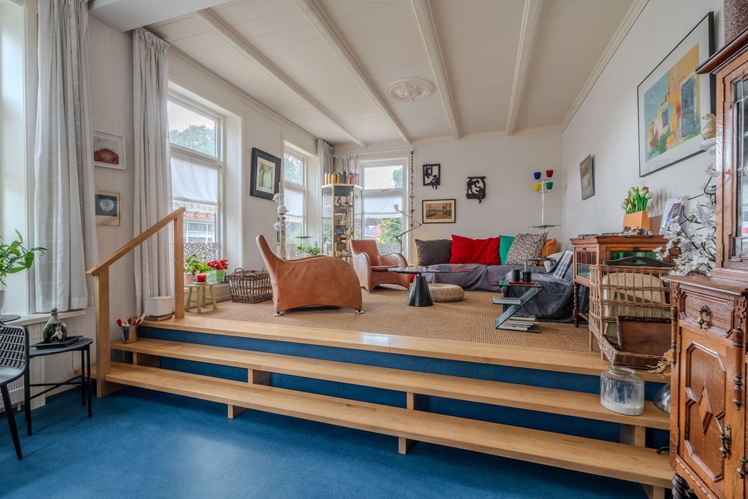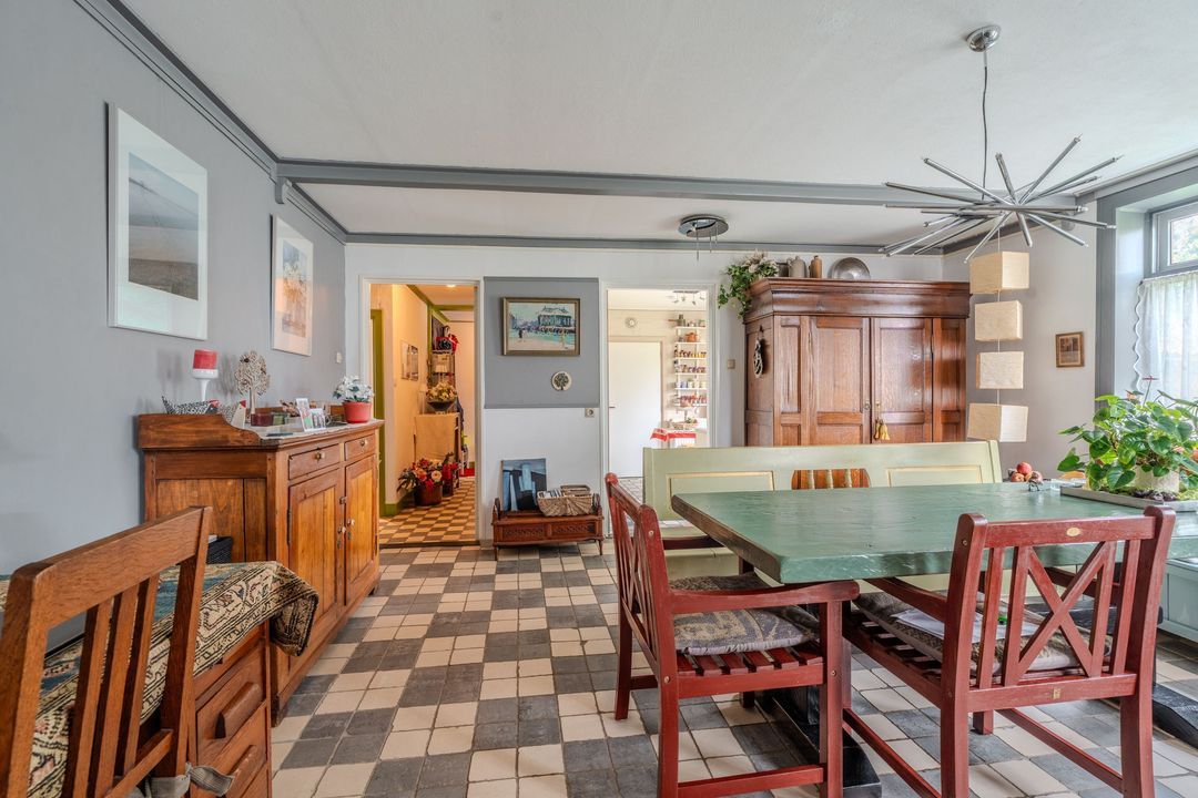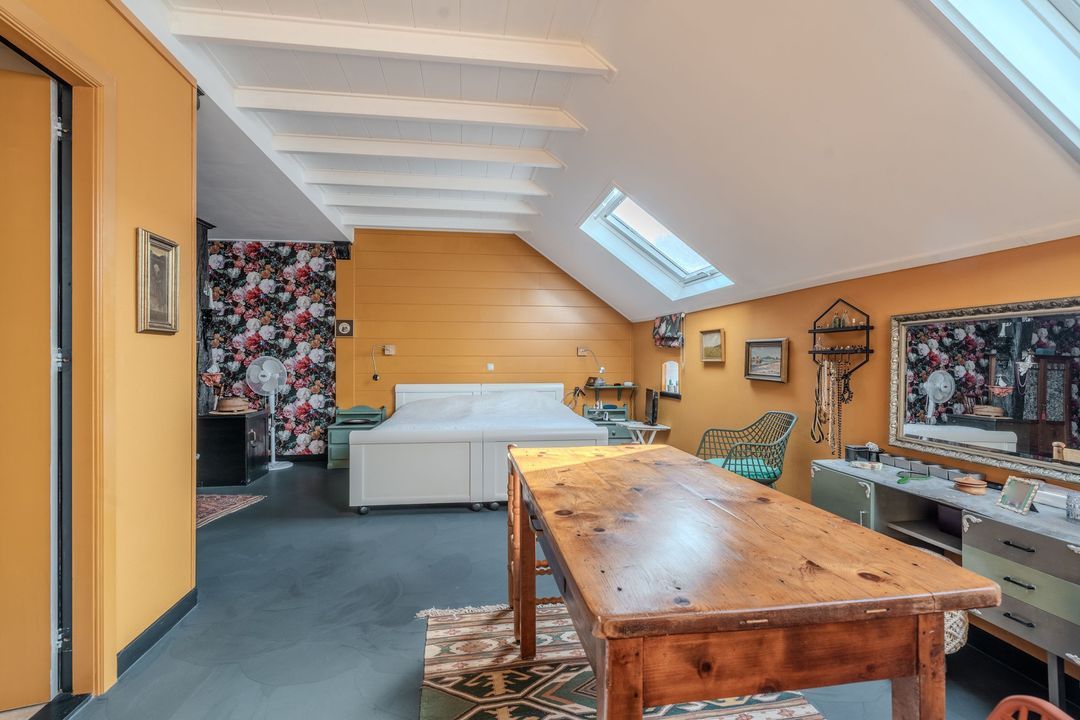 Begane grond: zij-entree/gang, woonkamer in split-level (ca. 40m²) met veel daglichtintreding, gezellige eetkamer (ca. 38m²) aan de tuinzijde, aangrenzende keuken met keukeninrichting en (inbouw)apparatuur, gang, toilet, zeer ruime slaapkamer (ca. 40m²), moderne badkamer met inloopdouche, wastafel met meubel, wandcloset en ligbad. Voorts een bijkeuken, trapopgang met bibliotheek, toegang tot de kelder, heel veel bergruimte (fietsenstalling) en natuurlijk de inpandige schuur van in totaal ca. 300m².