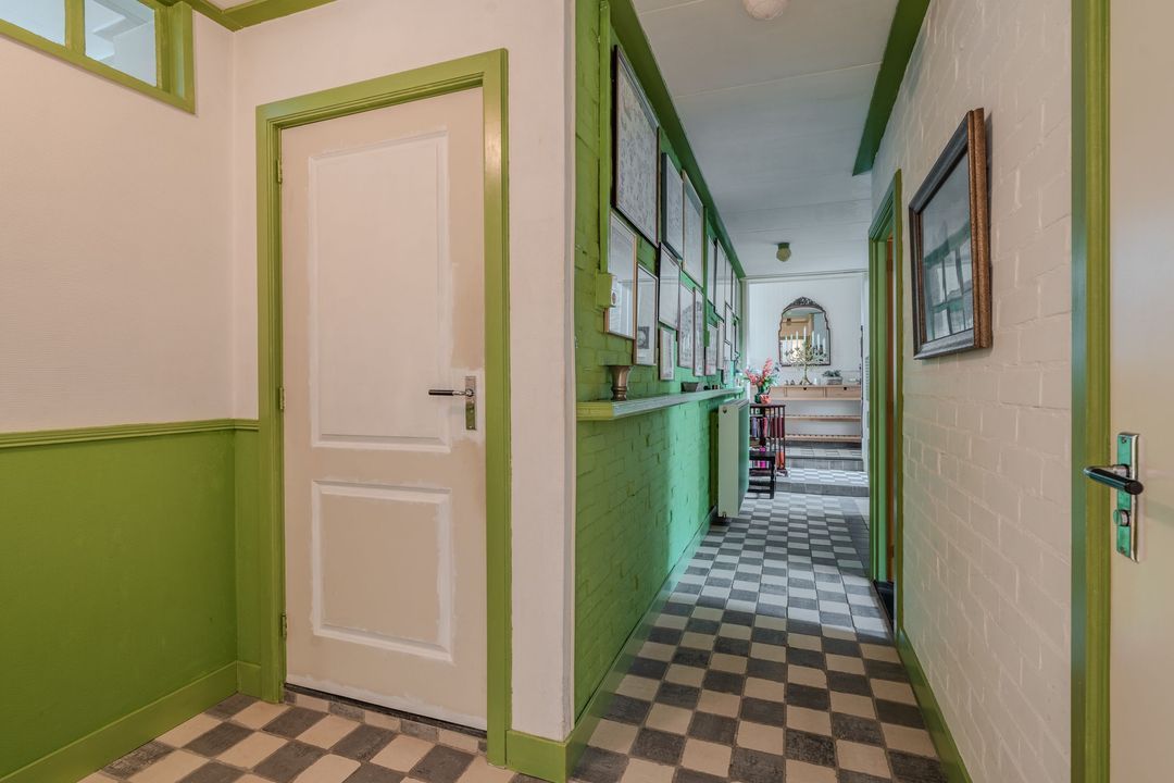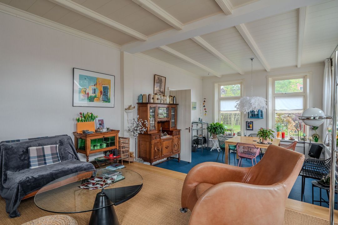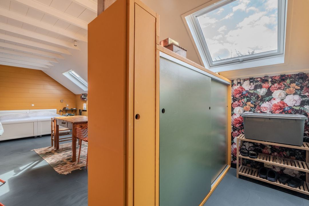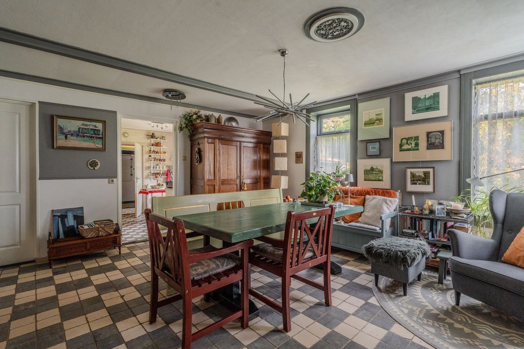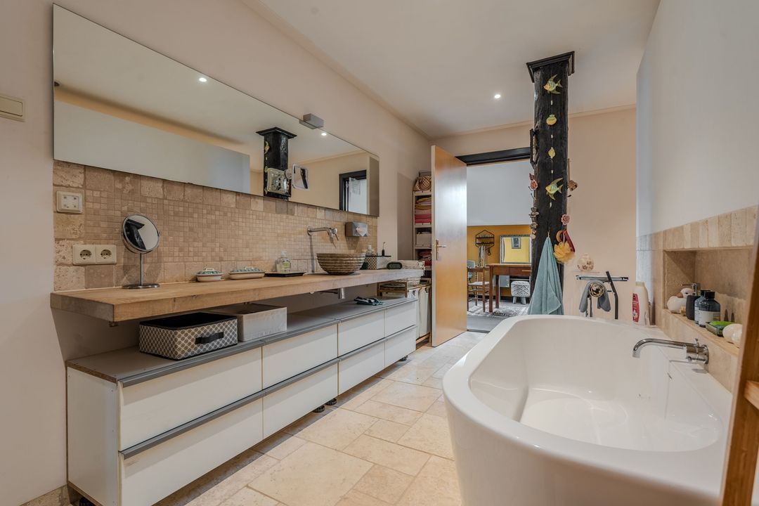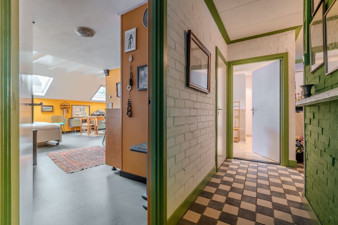 Begane grond: zij-entree/gang, woonkamer in split-level (ca. 40m²) met veel daglichtintreding, gezellige eetkamer (ca. 38m²) aan de tuinzijde, aangrenzende keuken met keukeninrichting en (inbouw)apparatuur, gang, toilet, zeer ruime slaapkamer (ca. 40m²), moderne badkamer met inloopdouche, wastafel met meubel, wandcloset en ligbad. Voorts een bijkeuken, trapopgang met bibliotheek, toegang tot de kelder, heel veel bergruimte (fietsenstalling) en natuurlijk de inpandige schuur van in totaal ca. 300m².