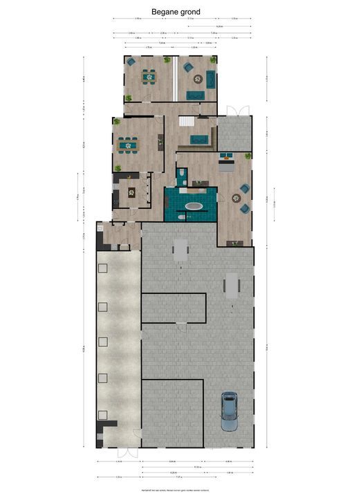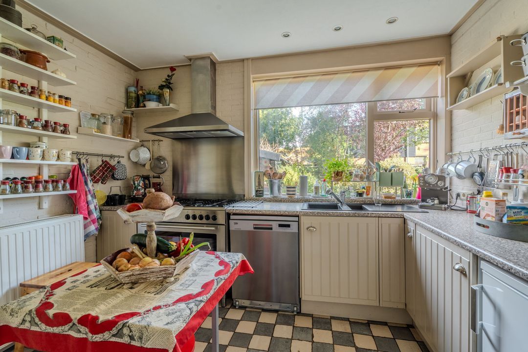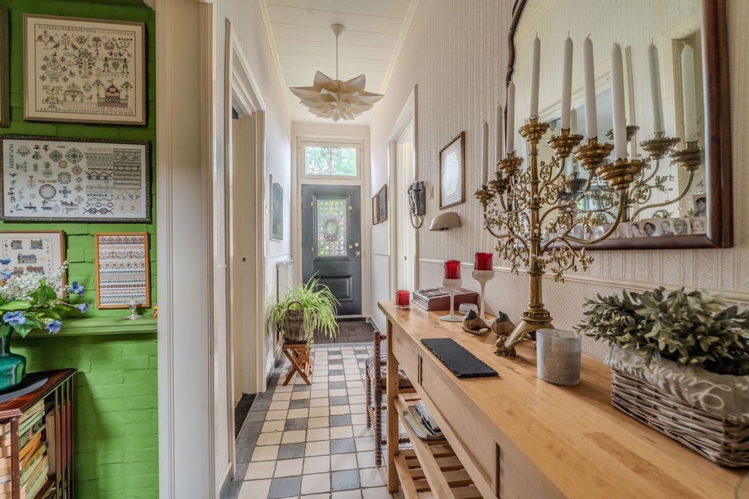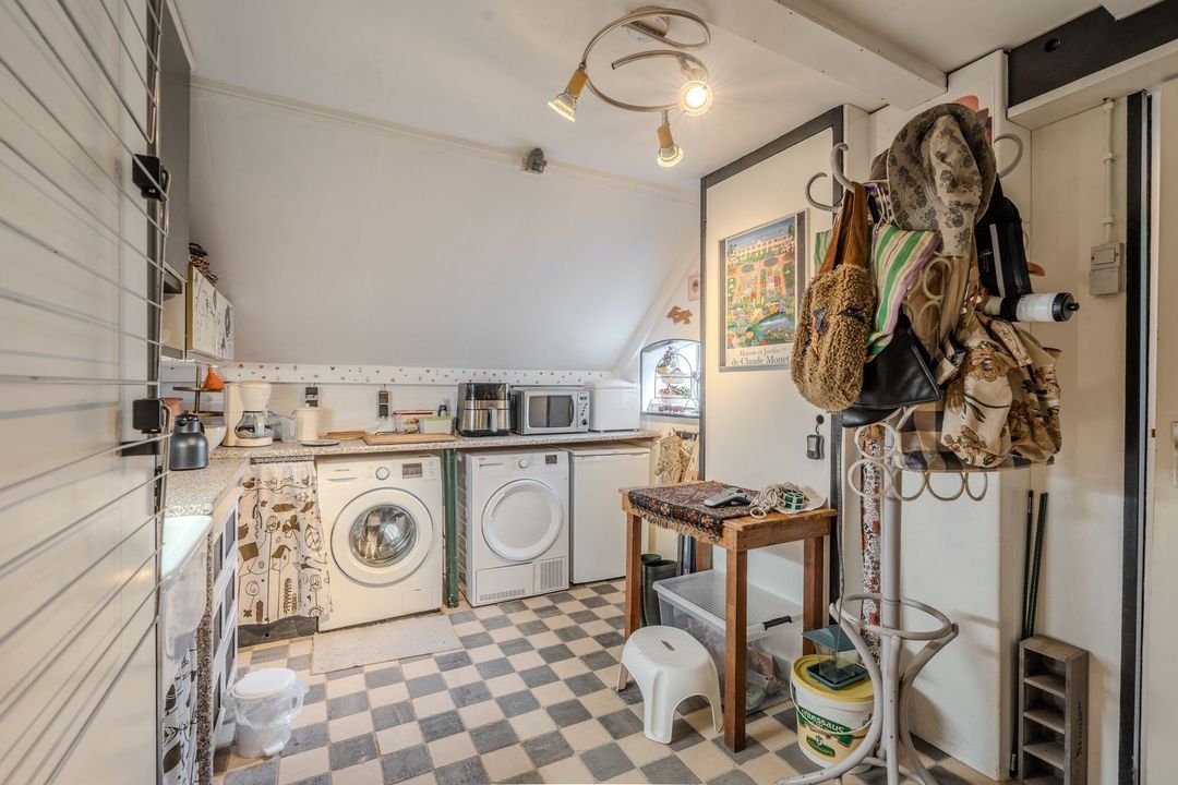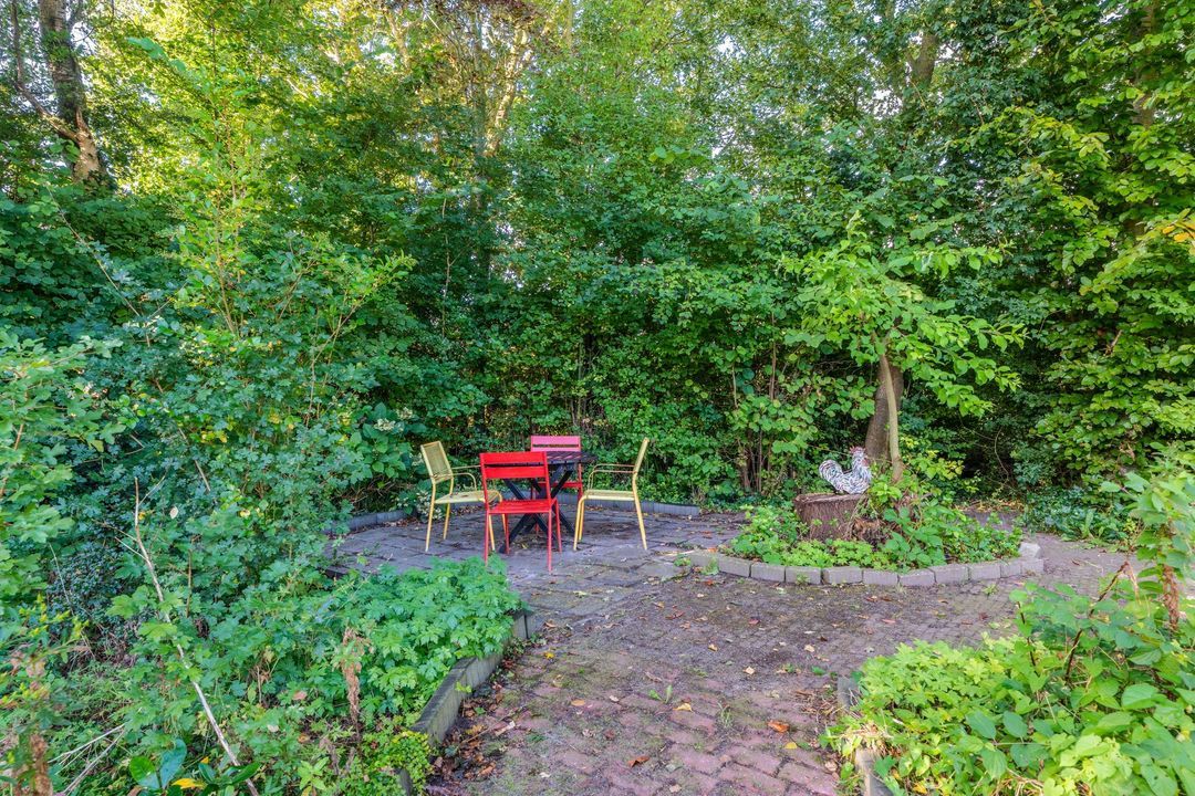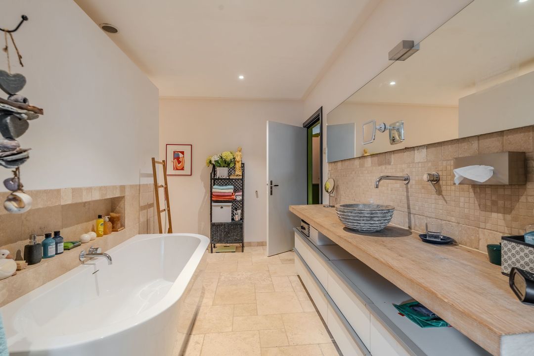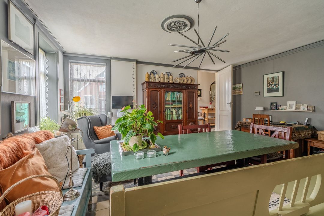 Begane grond: zij-entree/gang, woonkamer in split-level (ca. 40m²) met veel daglichtintreding, gezellige eetkamer (ca. 38m²) aan de tuinzijde, aangrenzende keuken met keukeninrichting en (inbouw)apparatuur, gang, toilet, zeer ruime slaapkamer (ca. 40m²), moderne badkamer met inloopdouche, wastafel met meubel, wandcloset en ligbad. Voorts een bijkeuken, trapopgang met bibliotheek, toegang tot de kelder, heel veel bergruimte (fietsenstalling) en natuurlijk de inpandige schuur van in totaal ca. 300m².